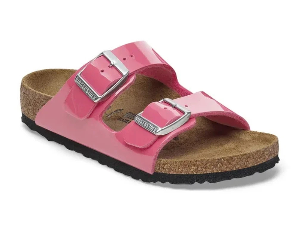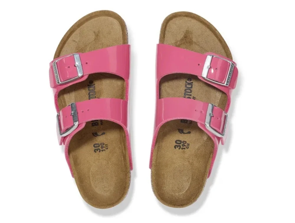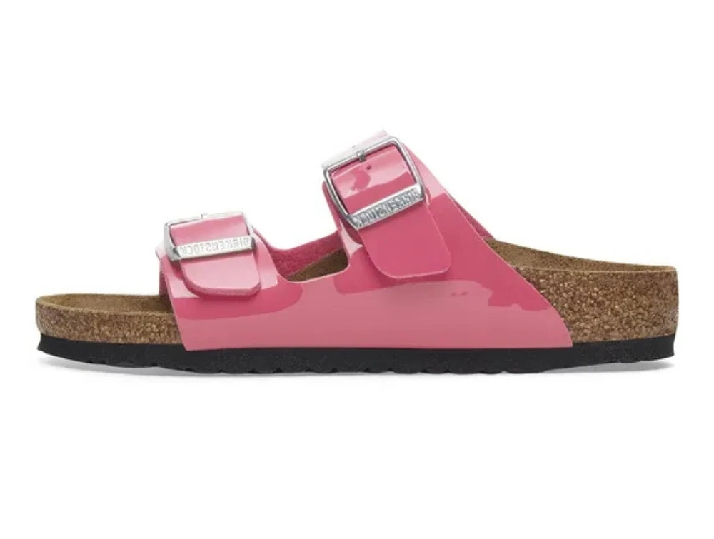 Arizona-sandal fra Birkenstock i pink med lakfinish og to spænder.