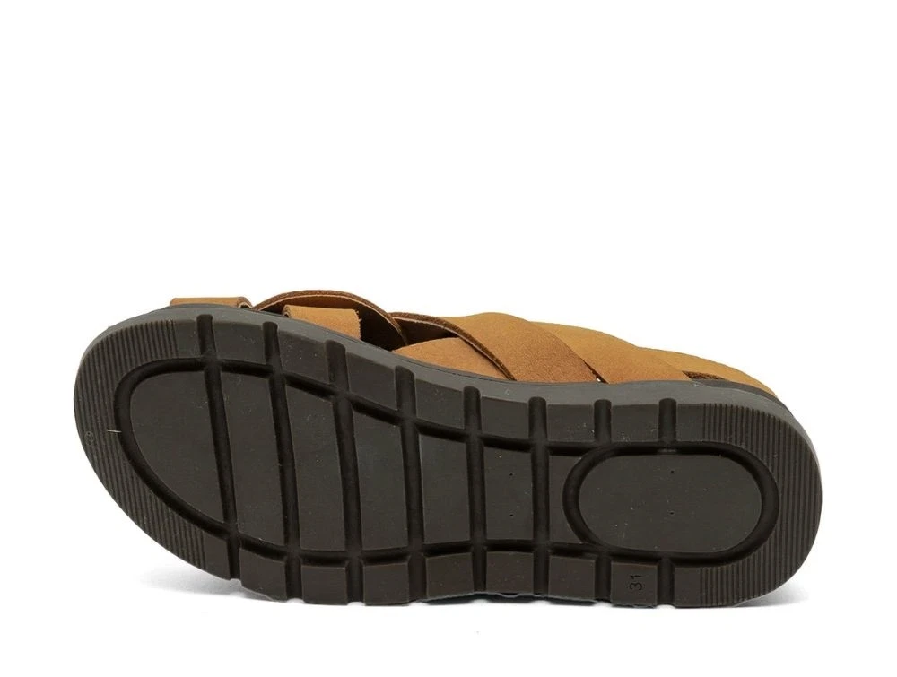 Cool camelfarvet skindsandal fra Bisgaard i modellen Arda – en flot sandal til større piger med elegant spænde og moderne fletdesign.