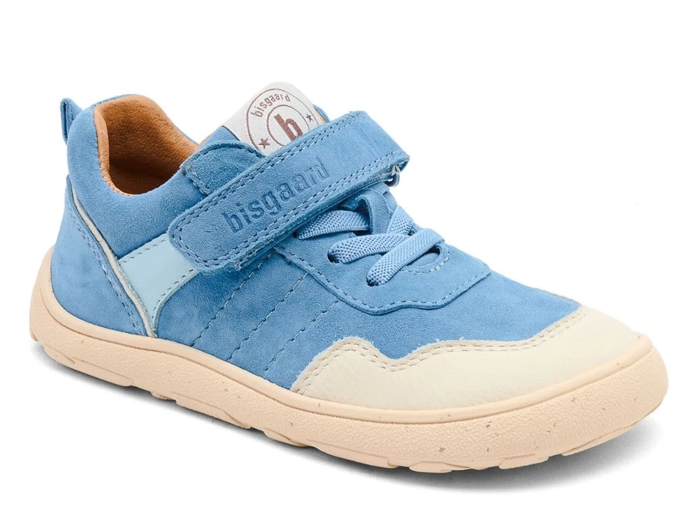 Sko i blå nuance fra Bisgaard – modellen Baloo er udviklet som en barfodssneaker i ruskind og læder. Den brede tåboks og flade sålkonstruktion giver foden frihed til at bevæge sig naturligt, mens den fleksible opbygning understøtter komfort i hverdagen.