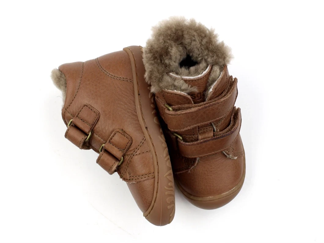 Vinterbegyndersko i farven brandy fra Bisgaard i læder med velcro. Skoene har et lækkert foer af 100% rulam. Skoenes gummisål er meget fleksibel og bøjelig og går op over snuden. Hvis skoene flittigt behandles med læderfedt, kan en vandafvisende effekt opnås, men skoene har ikke TEX-membran. Fri for skadelige kemikalier. Håndlavet i Portugal.