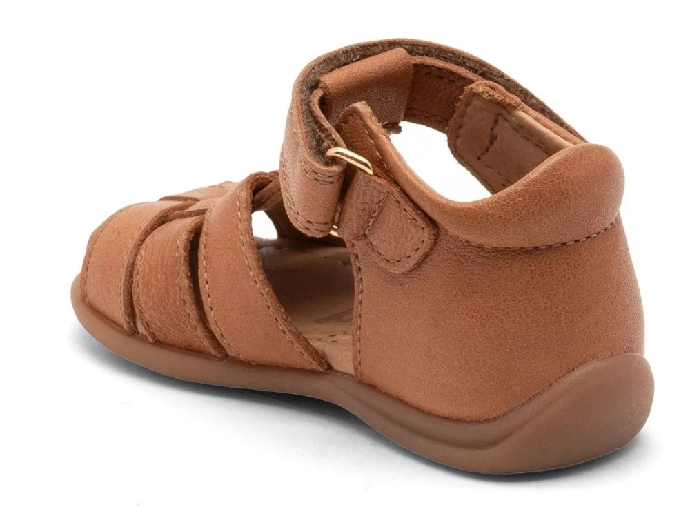 Sandalen har en lukket snude, fast hælkappe og brun fleksibel gummisål. Den lukkes nemt med velcro og har kromfrit læderfor og -indersål.