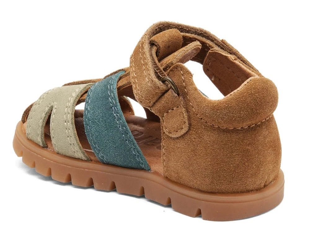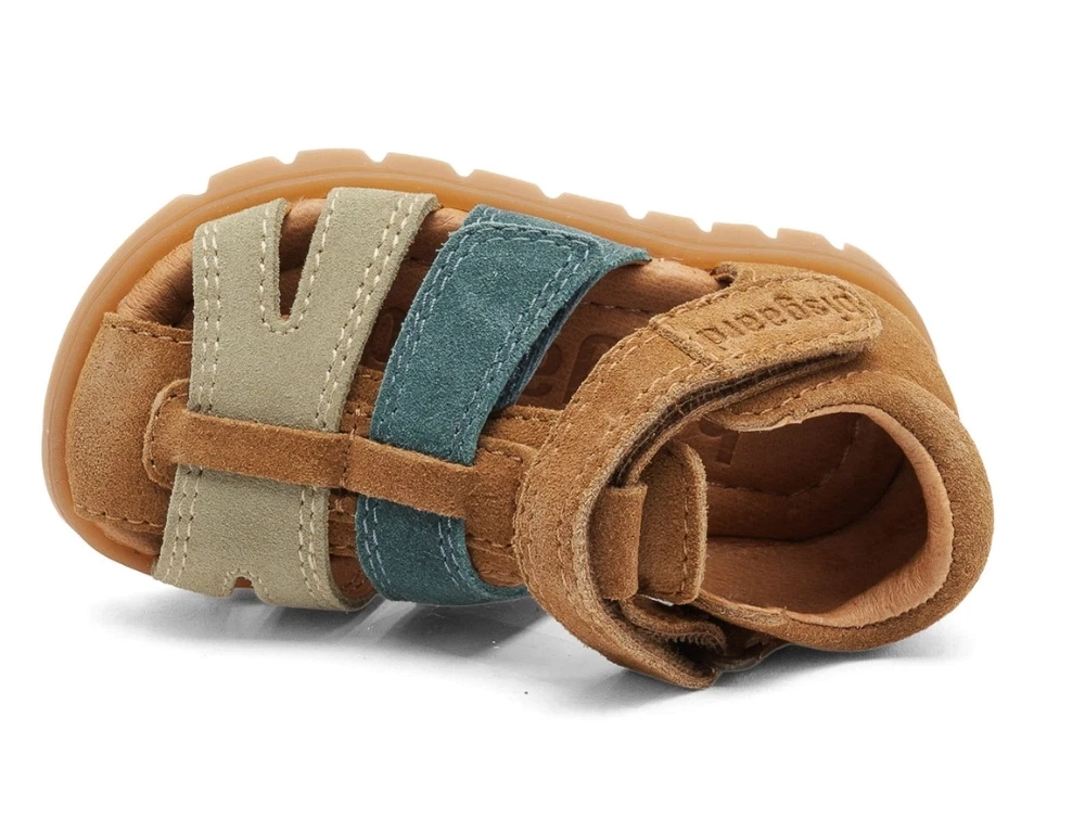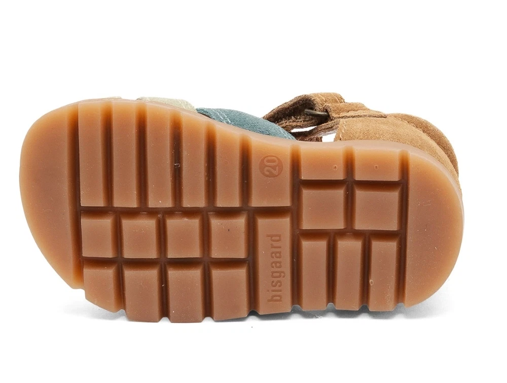 Bisgaard Frans sandal i brun nuance er en lukket børnesandal i blødt læder med farvede remme og justerbare velcrolukninger. Sandalen giver god støtte omkring foden og har en lukket tå, som beskytter tæerne under leg og bevægelse.