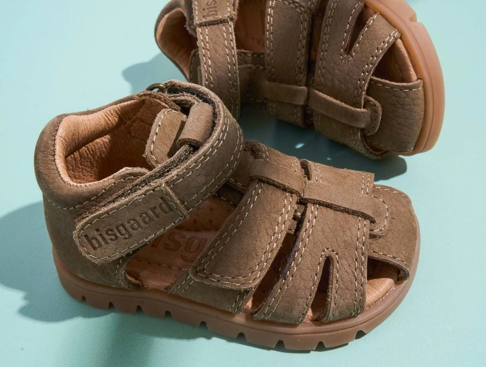 Bisgaard Frans sandal i brun nuance er en klassisk lukket børnesandal i blødt læder. Sandalen har en beskyttende lukket tå, fleksibel sål og justerbare velcrolukninger, som giver en stabil pasform omkring foden.