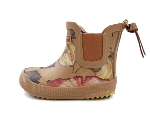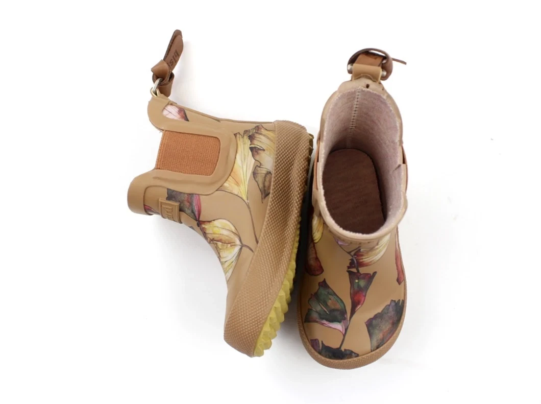 Korte gummistøvler i farven camel med blomsterprint fra Bisgaard.