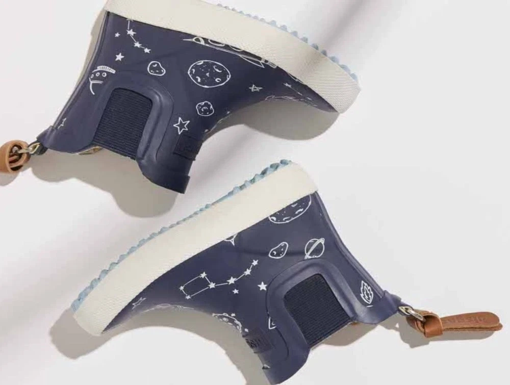 Korte gummistøvler i blå med austronaut-print (to the moon) fra Bisgaard.
