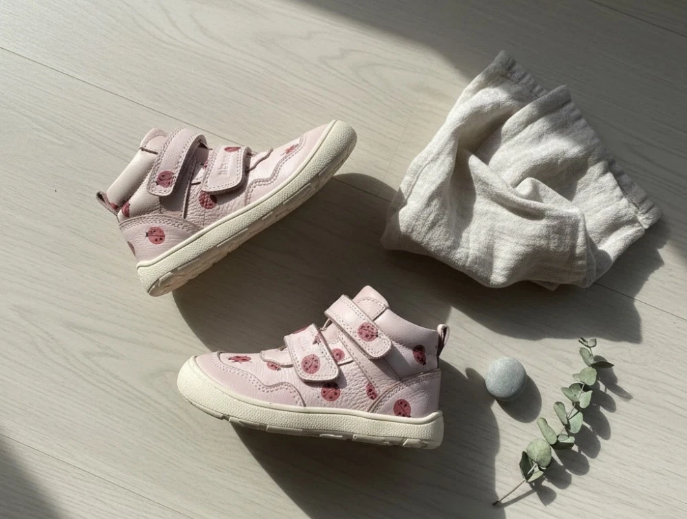 Sko i lyserød nuance med mariehøns (lady bugs) fra Bisgaard. Becky er en let sko designet til små, aktive fødder, hvor bevægelsesfrihed og komfort er i fokus. De fine mariehøns giver et kært udtryk, mens den fleksible konstruktion følger barnets naturlige bevægelser.