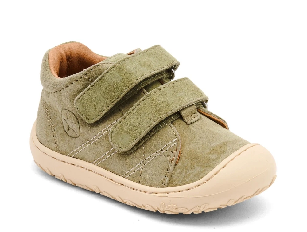 Sko fra Bisgaard i en støvet grøn nuance i ruskind. Skoene er lavet til børn i alderen ca. 1-3 år og er lette og fleksible, hvilket gør dem velegnede til børn, der er ved at tage deres første skridt. Modellen Hale V har en støttende opbygning og er nem at justere med velcrolukning.