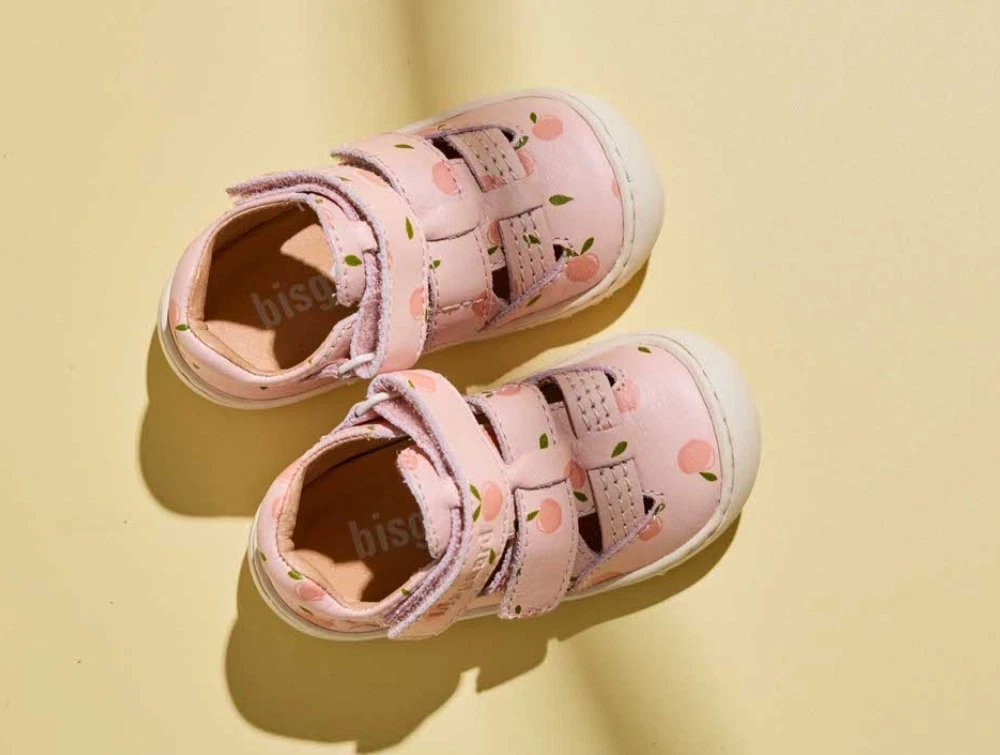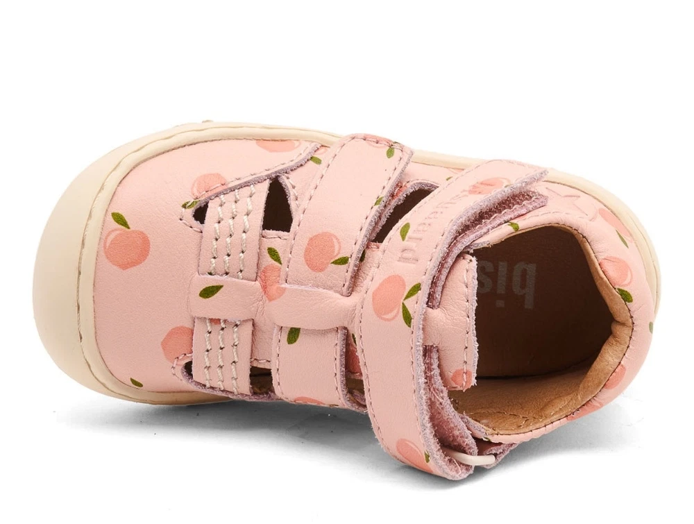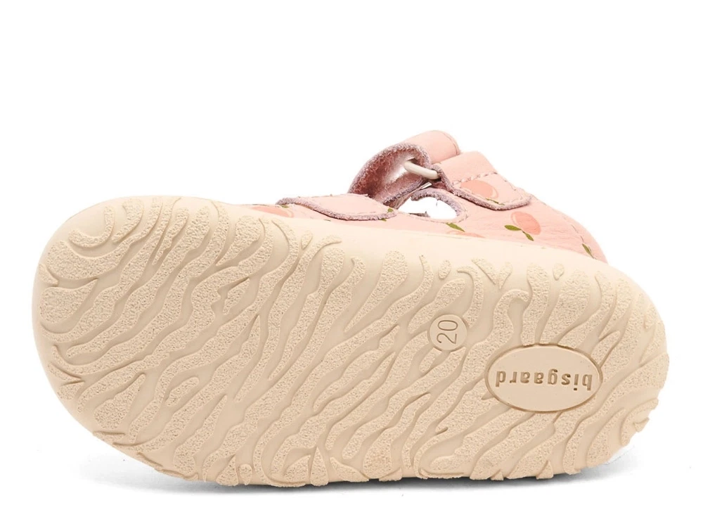 Bisgaard Hana sandal med ferskenprint er en let og fleksibel sandal designet til de mindste børn og er perfekt som første sko, men kan også bruges af børn, som allerede kan gå. Skoen har en beskyttende gummisnude, blødt læder og praktiske velcrolukninger, som gør den nem at tage af og på.