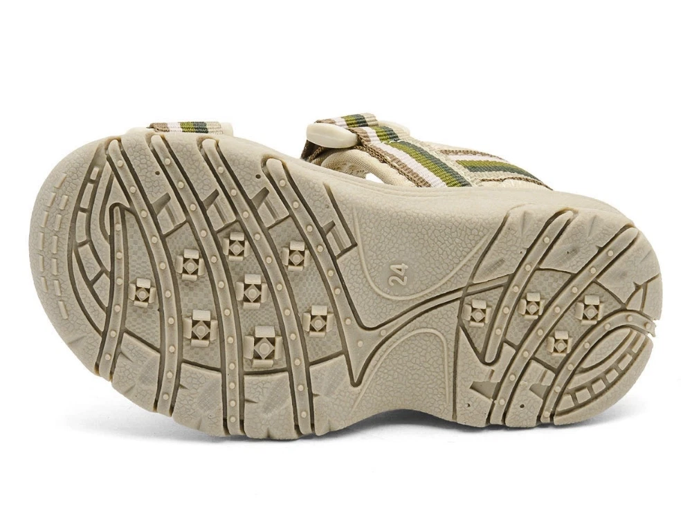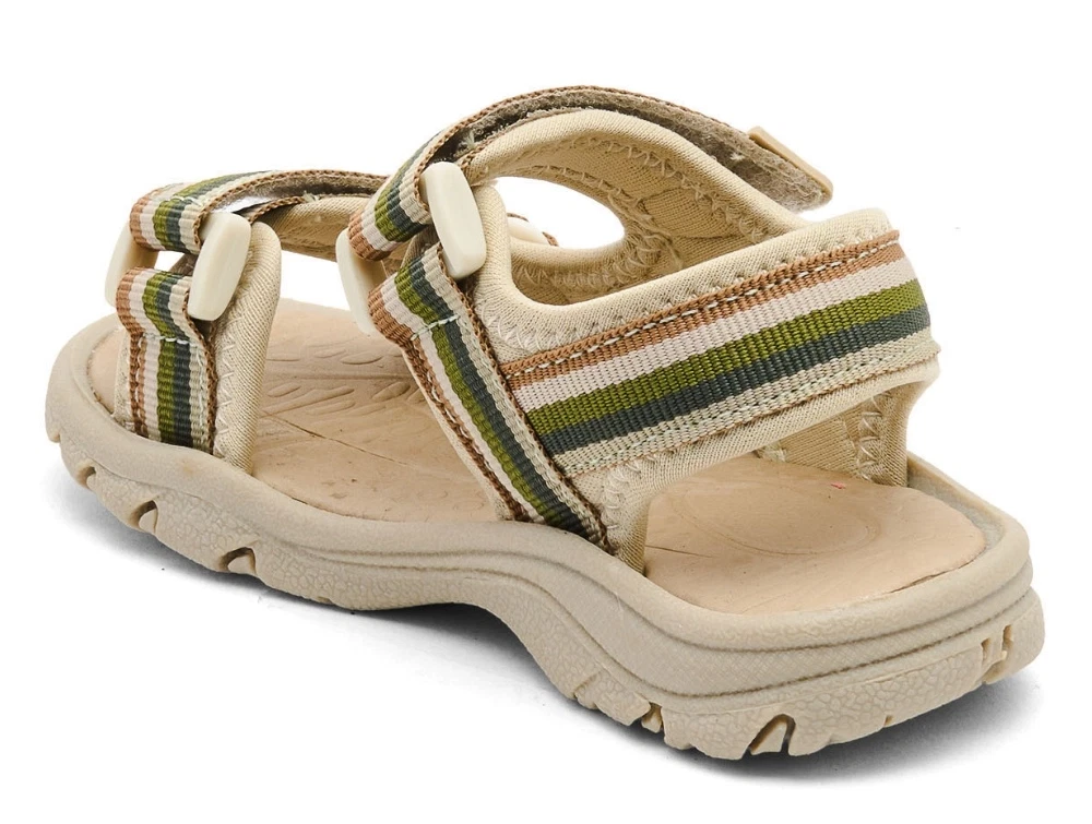 Bisgaard Nico sandal i beige nuance med grønne striber er en let og sporty børnesandal med fleksible tekstilremme og blød neopren på indersiden. Sandalen har en åben konstruktion og justerbare velcrolukninger, som giver en stabil pasform til aktive sommerdage.