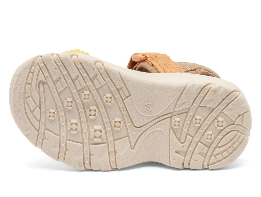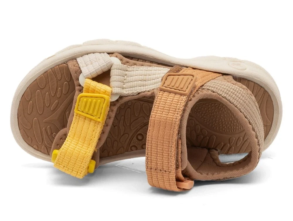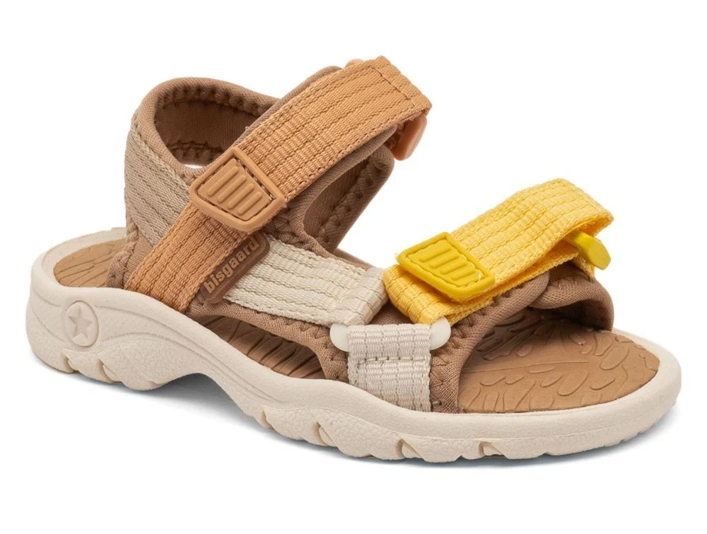 Let sporty sandal fra Bisgaard med multifarvede remme i gul og brun tema.