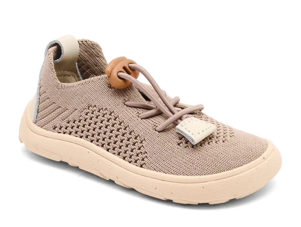 Luftig tekstil-sko i beige/grå (stone) nuance fra Bisgaard – modellen Jua er en let og fleksibel barfodssko. Overdelen er fremstillet i en strikket tekstilkonstruktion, som giver en soklignende pasform omkring foden og gør skoen både let og åndbar.