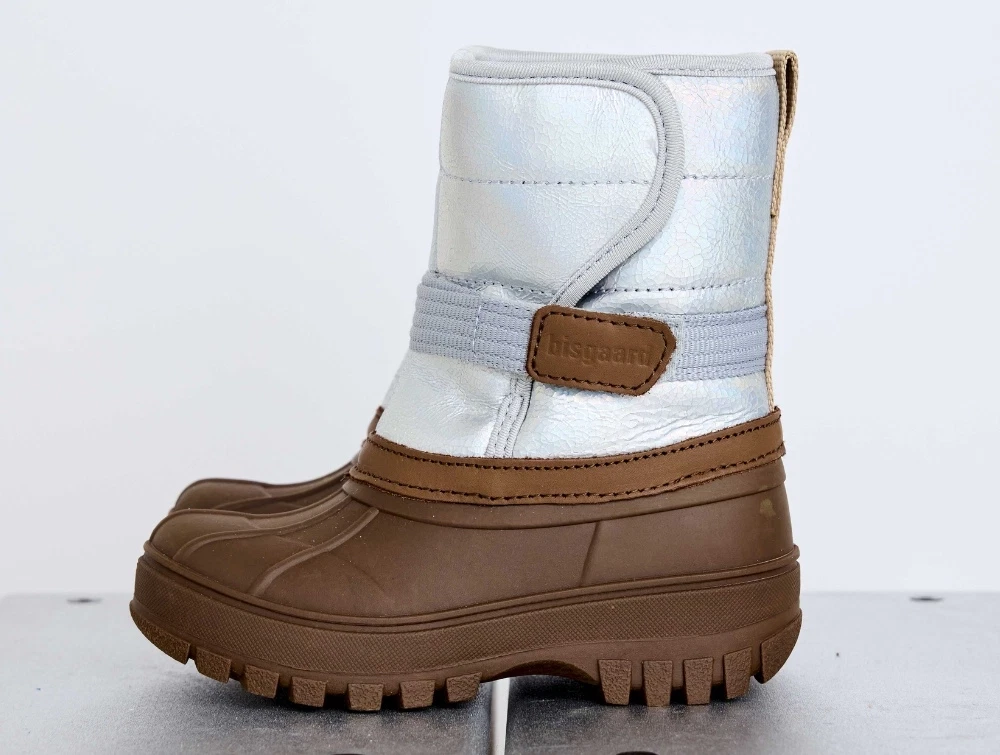 Bisgaard Pacson snestøvle i farven galaxy er en varm og praktisk vinterstøvle til børn. Den kombinerer sølvfarvet tekstil med skinnende overflade og en solid brun TPR-ydersål, der giver klassisk snestøvle-look og beskyttelse i vintervejr.