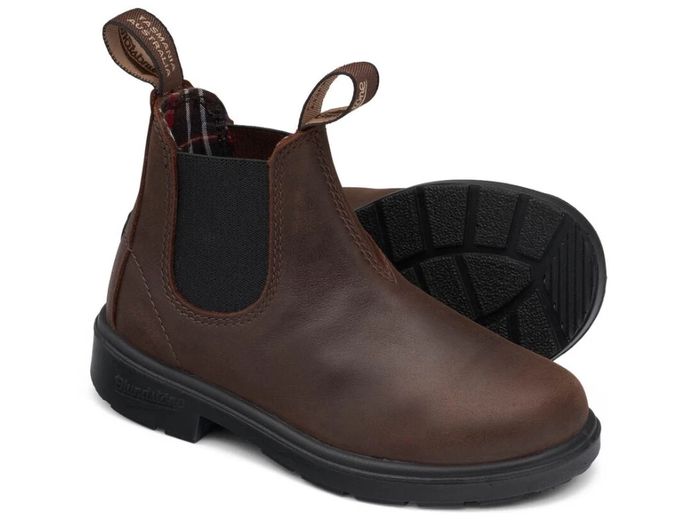 Blundstone Blunnies børnestøvle i brun læder. En klassisk chelsea-støvle til børn med elastik i siderne og praktiske stropper, der gør den nem at tage af og på.