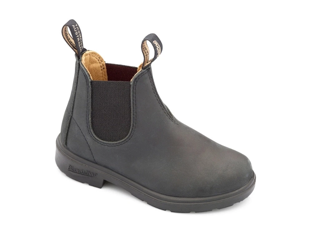 Blundstone Blunnies børnestøvle i sort rustik læder. En klassisk chelsea-støvle til børn med sort elastik i siderne og praktiske stropper, der gør den nem at tage af og på.