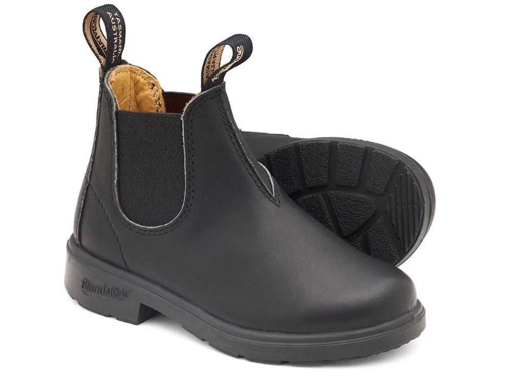 Blundstone Blunnies børnestøvle i sort læder. En klassisk chelsea-støvle til børn med elastik i siderne og praktiske stropper, der gør den nem at tage af og på.