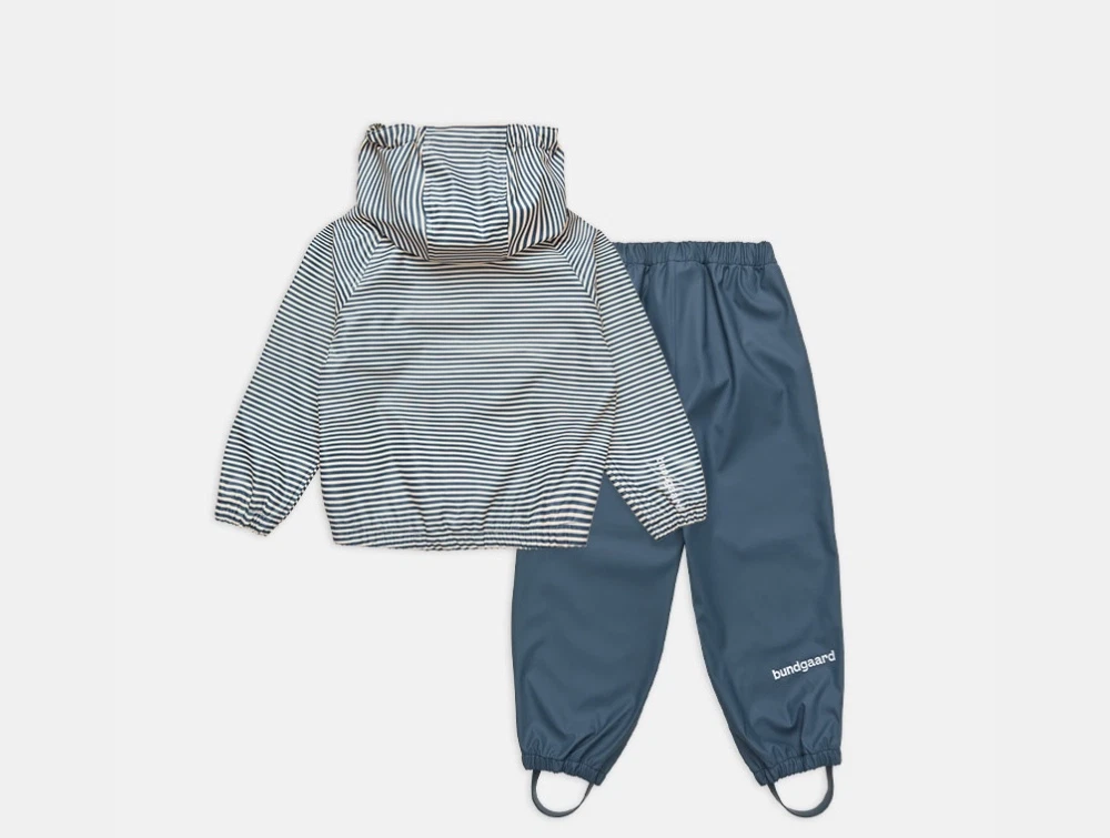 Blåstribet regnjakke og ensfarvede regnbukser fra Bundgaard. Cayce er et funktionelt regnsæt bestående af regnjakke og regnbukser i et let og smidigt materiale, der giver god bevægelsesfrihed. Sættet er designet til aktive børn og kombinerer klassiske striber med ensfarvede bukser i en rolig, nordisk stil. Almindelig pasform med elastiske afslutninger sikrer, at sættet sidder godt under leg og udeliv.