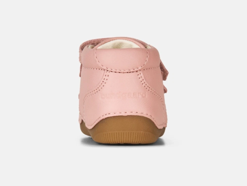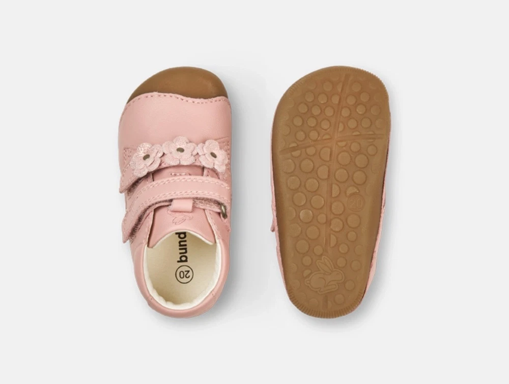 Begyndersko i rosa nuance fra Bundgaard – modellen Petit Flower er udviklet til barnets første skridt og har et klassisk udtryk med små blomsterdetaljer på remmen.