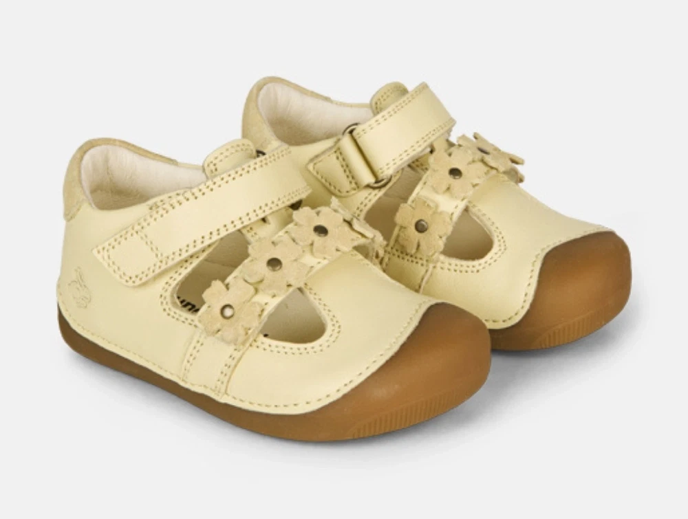 Sandal i gul nuance fra Bundgaard i modellen Petit Summer Flower. En begyndersandal med lukket tå og fine blomsterdetaljer, der er designet til de første skridt med fokus på fleksibilitet, støtte og naturlig bevægelse.