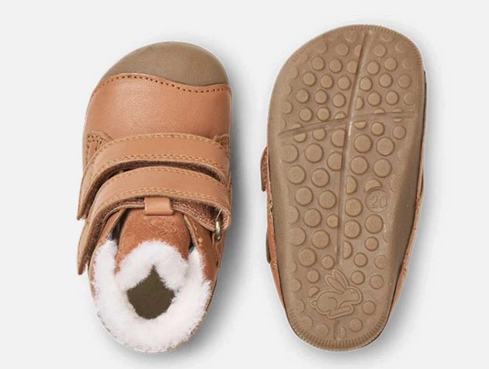 Petit Winter fra Bundgaard er en klassisk begyndersko i cognacfarvet læder med varmt uldfoer. Skoen er designet til små fødder, der skal i gang med at stå og tage de første skridt, og kombinerer fleksibilitet med støtte.