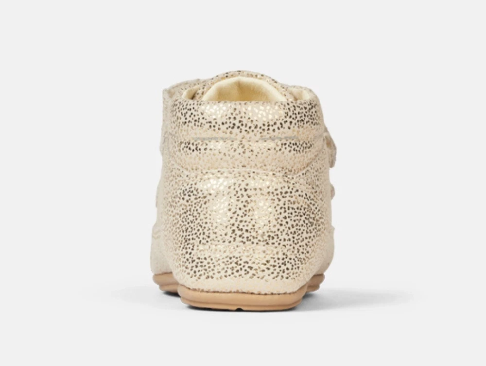 Prewalker i skind i en guldfarvet glitter nuance fra Bundgaard. Bundgaard prewalkeren er en klassisk sko designet til at give de mindste god komfort og støtte, når de tager deres første skridt. Den er fremstillet i LWG-certificeret læder og har en blød, meget fleksibel gummisål. Indersålen er ligeledes blød og behagelig for små fødder.