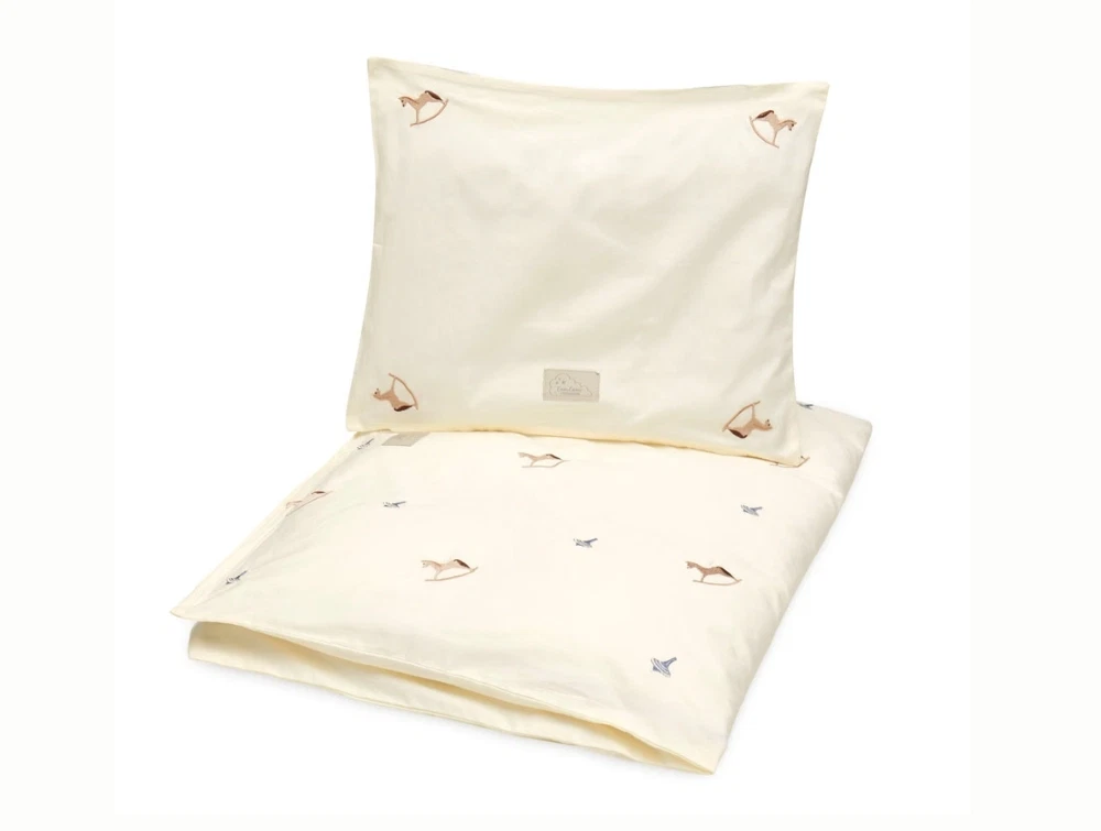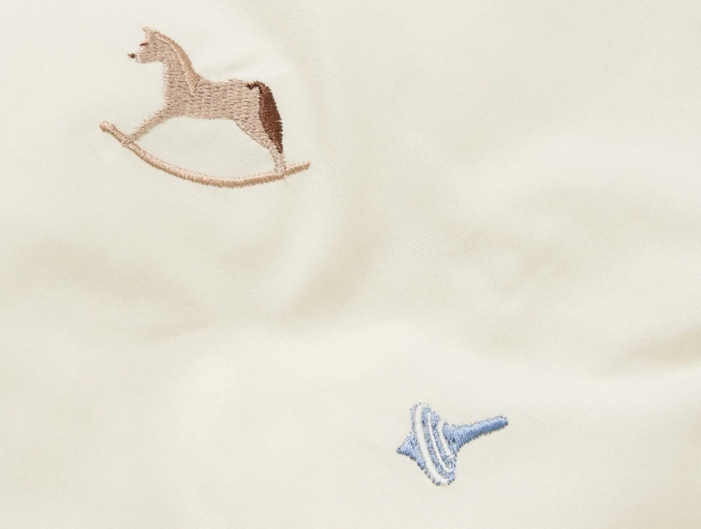 Cam Cam Copenhagen broderet babysengetøj i råhvid nuance med vintage toys motiverCam Cam Copenhagen broderet babysengetøj i brug med vintage toys motiverCam Cam Copenhagen broderet babysengetøj detalje med vintage toys broderiCam Cam Copenhagen broderet babysengetøj leveret i matchende stofpose med broderi