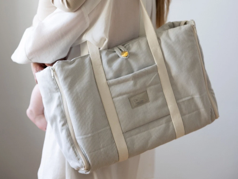 Tasken har mange praktiske rum indvendigt til bleer, skiftetøj og småting samt udvendige lynlåslommer for hurtig adgang. Der medfølger aftagelig stofble, der giver ekstra blødhed ved bleskift, og som nemt kan vaskes efter brug. De lange stropper gør tasken behagelig at bære på skulderen, og de medfølgende barnevognsstropper gør den let at fastgøre på styret.