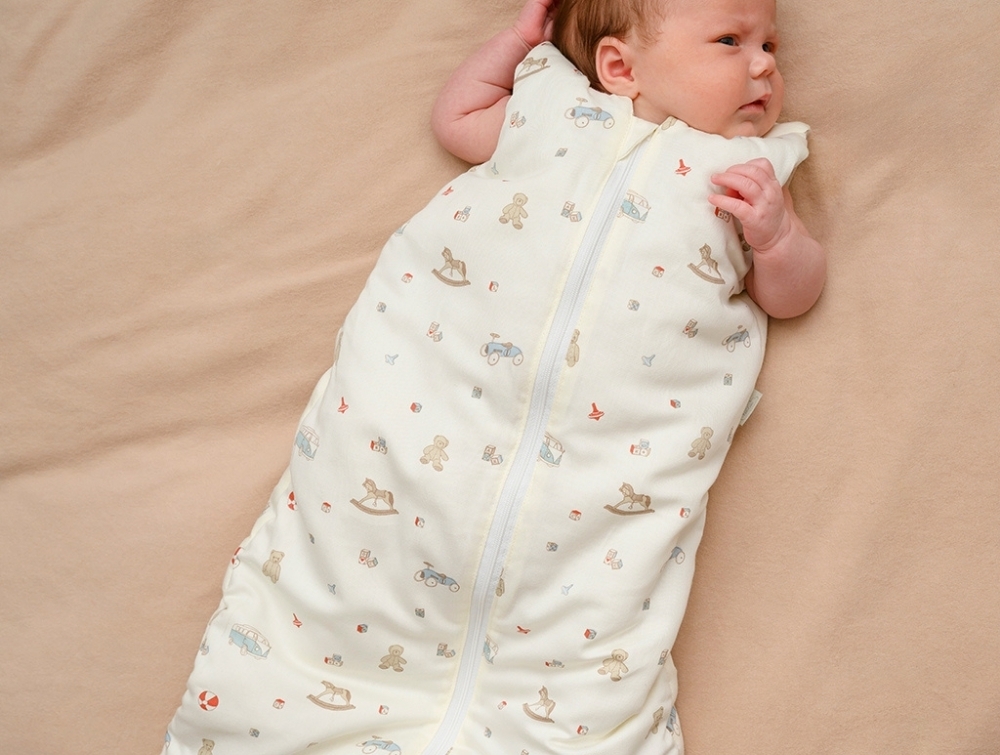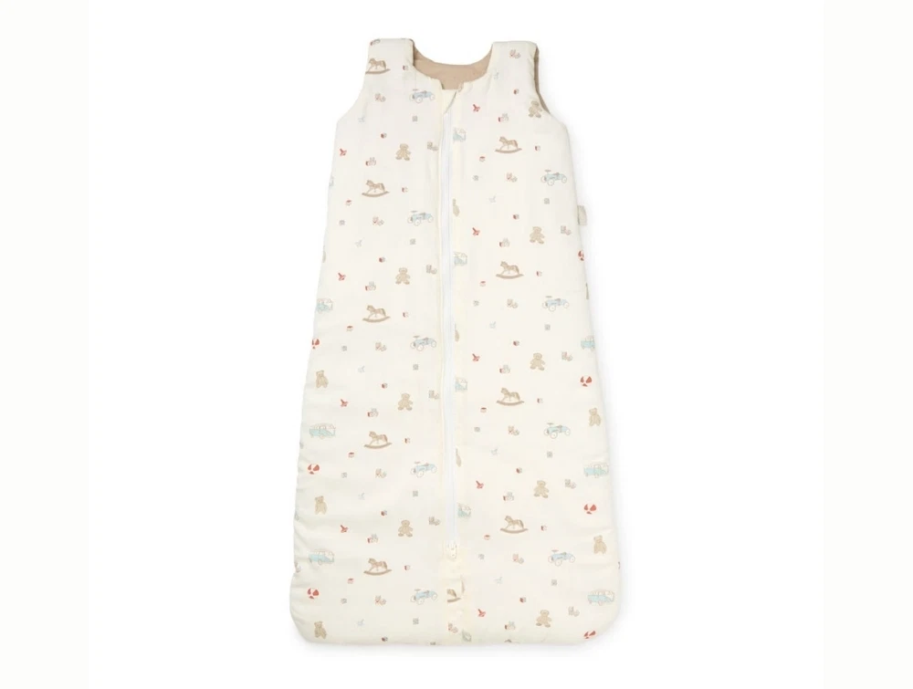 Cam Cam Copenhagen sovepose i brug til baby med vintage toys printCam Cam Copenhagen sovepose i råhvid nuance med vintage toys print