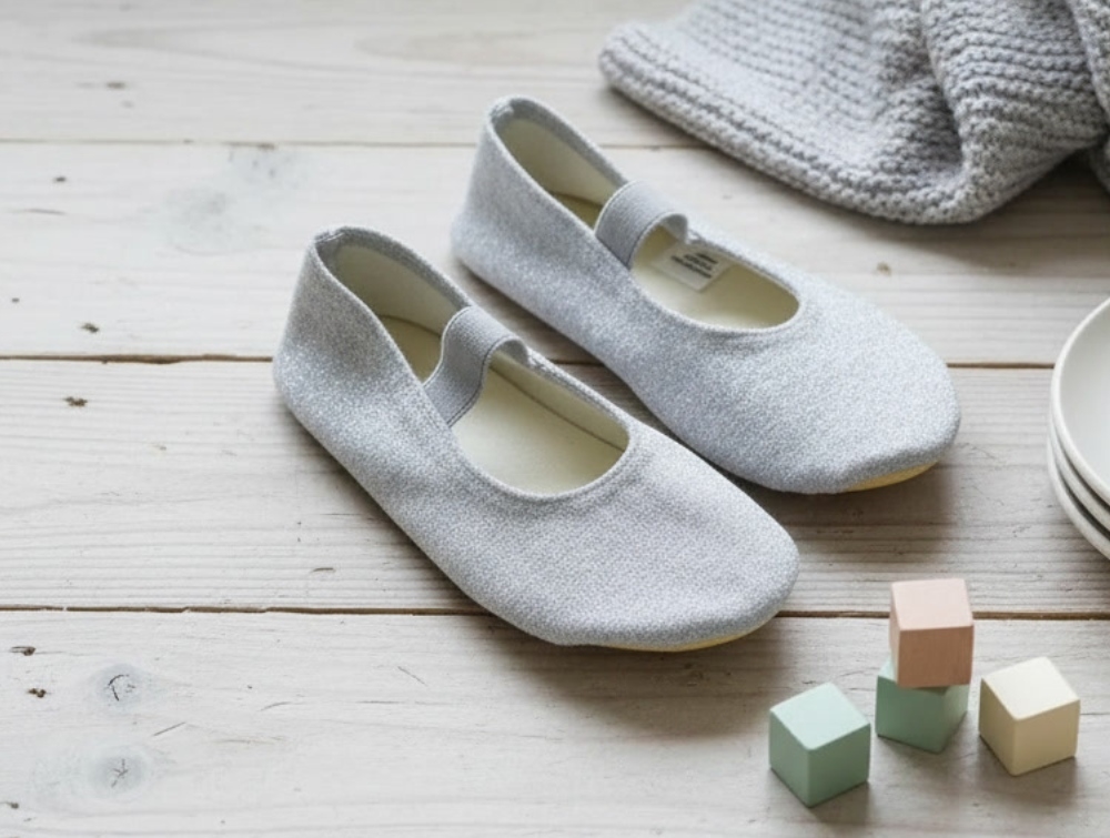 Sølvfarvede gymnastiksko fra Carite i 100% polyester. Skoene er super lette og har en fleksibel, tynd, skridsikker og meget blød gummisål i økologisk gummi.