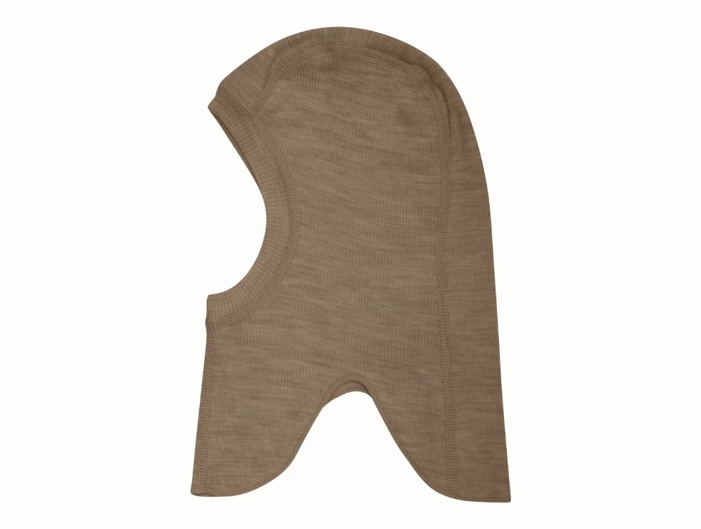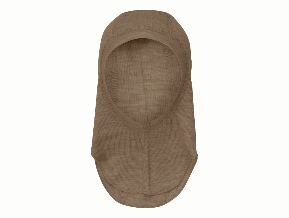 Balaclava i brun nuance (cocoa creme) fra CeLaVi, fremstillet i blød 2x2 ribbet merinould.