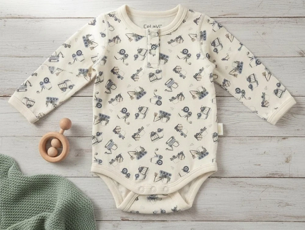 Der er et sødt print af traktorer og maskiner på bodyen.