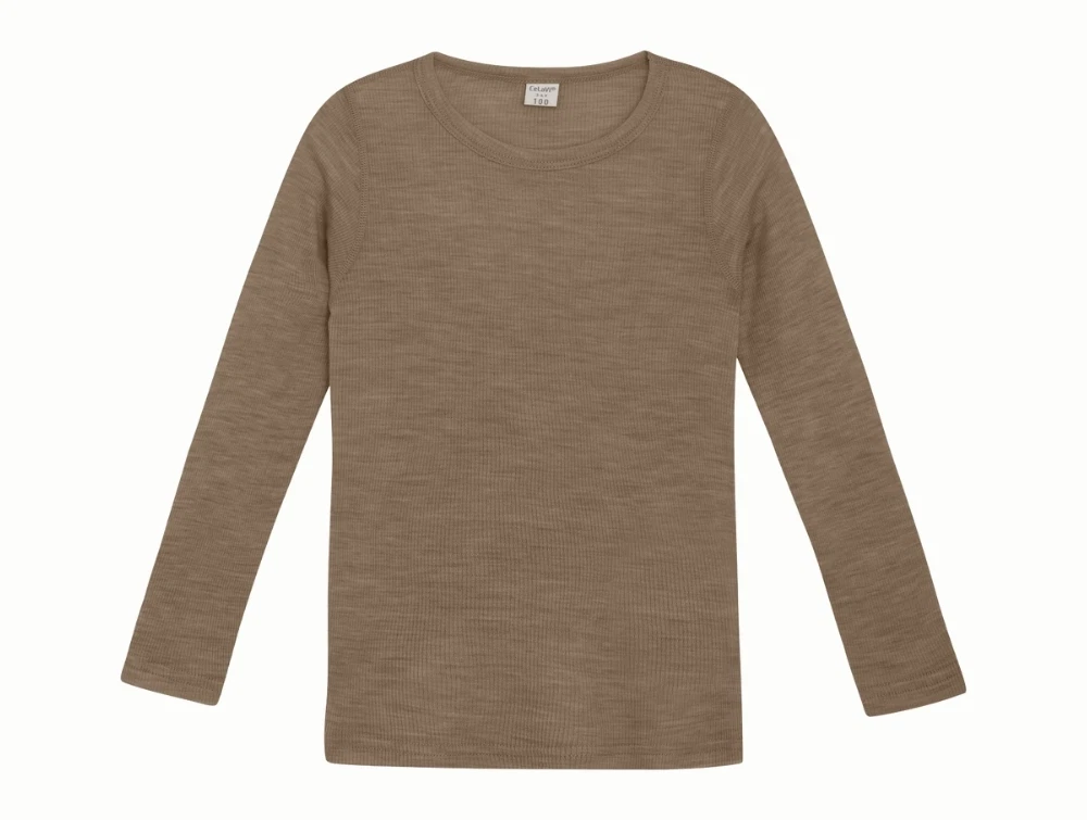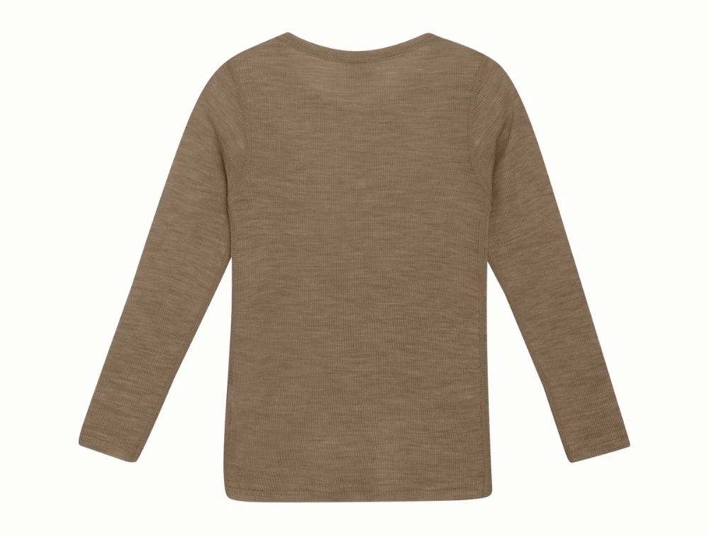 CeLaVi brun merinould bluse forfraCeLaVi brun merinould bluse rib detaljeCeLaVi brun merinould bluse bagfra
