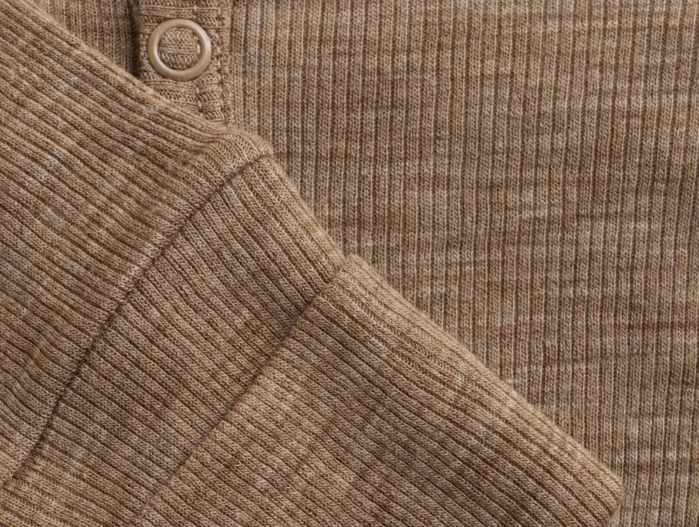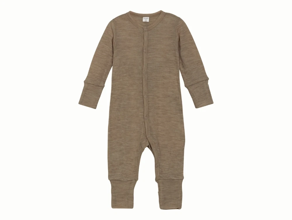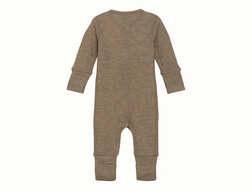 CeLaVi heldragt cocoa creme i merinould med trykknapperCeLaVi brun merinould heldragt forfraCeLaVi brun merinould heldragt rib detaljerCeLaVi brun merinould heldragt bagfra