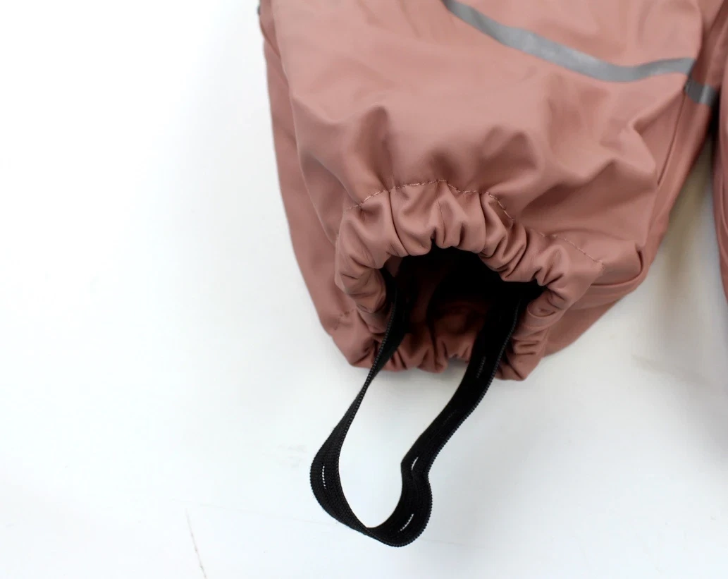 Dragten har aftagelig hætte med trykknapper og refleks på det ene bukseben og ærme. Ved benslut er der aftagelige fodstropper.