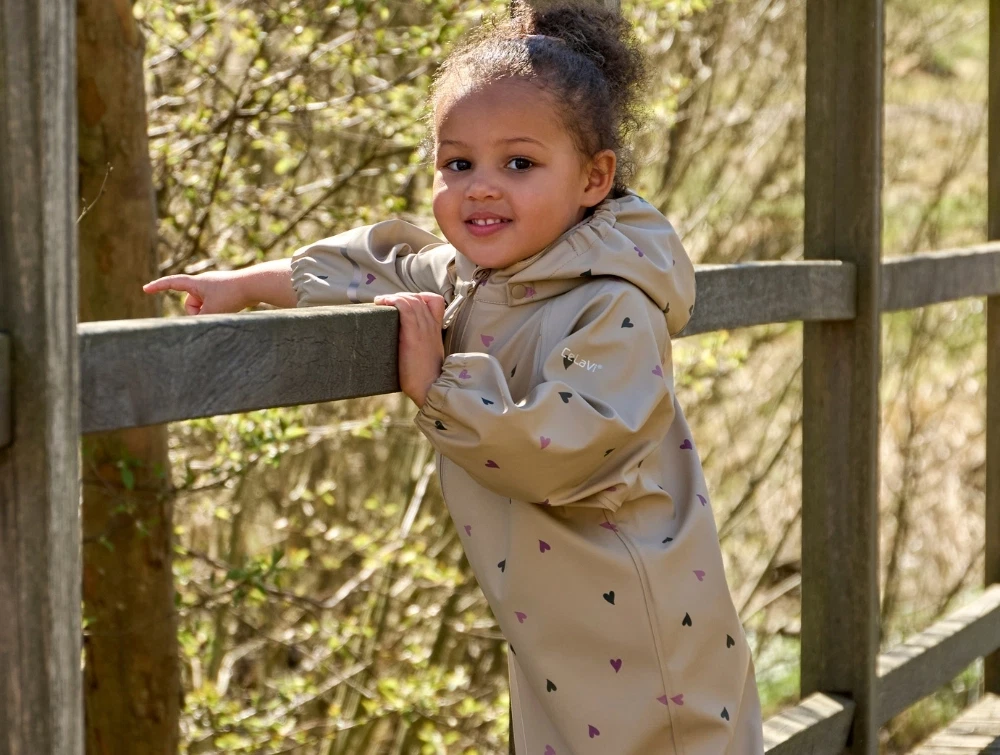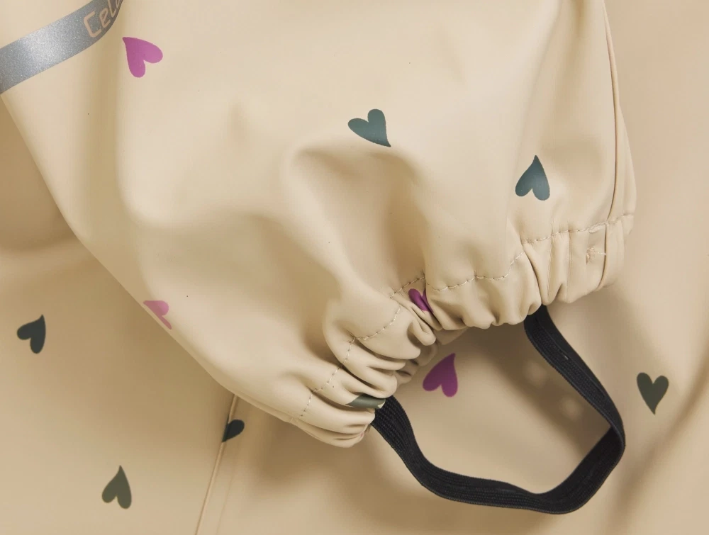 Regndragt i sand nuance (white pepper) fra CeLaVi med små hjerter.