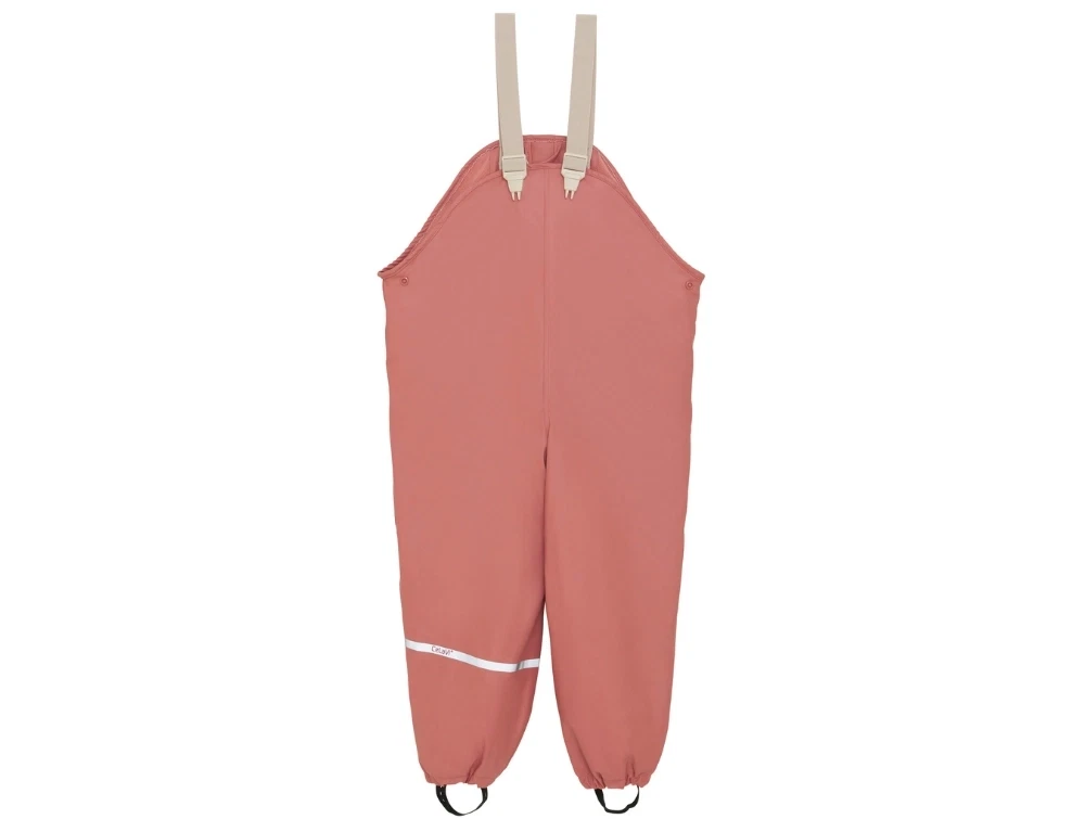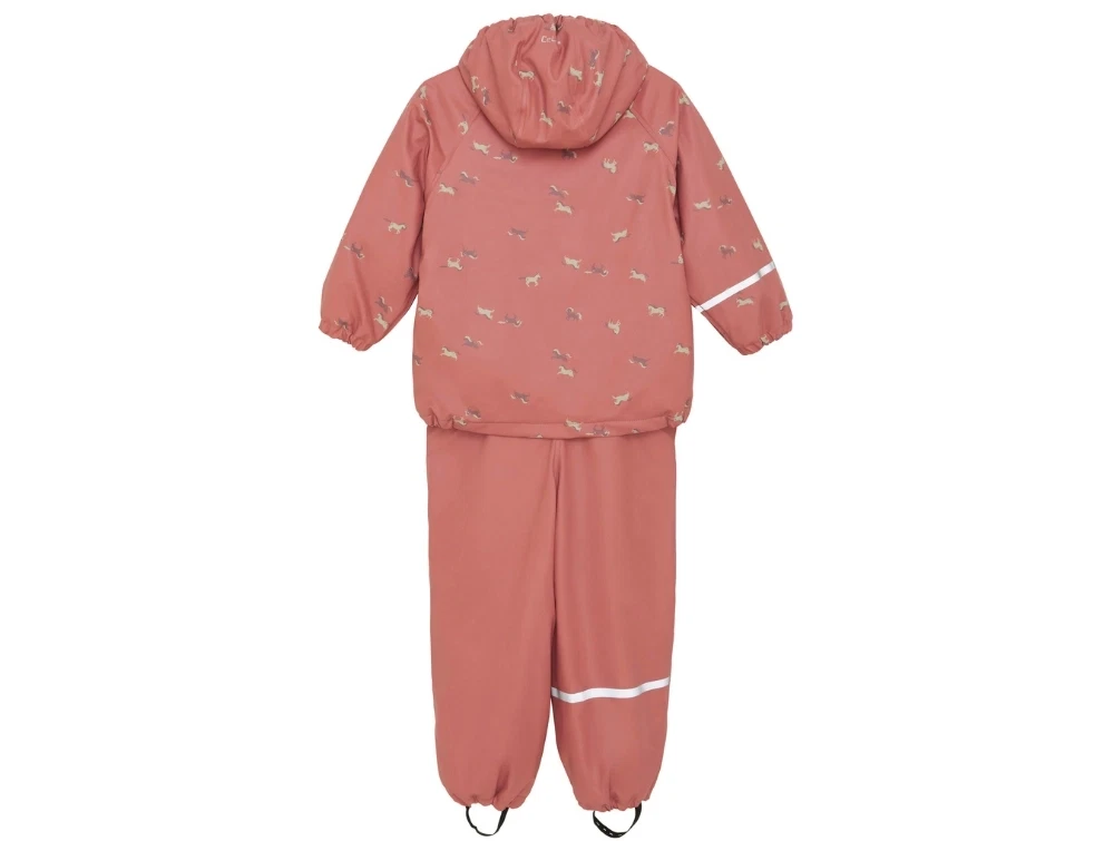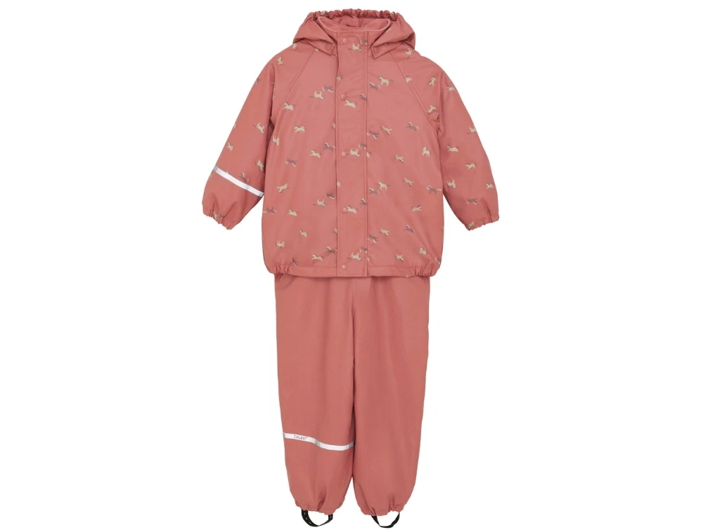 Regnsæt i en rosa nuance (brick dust) fra CeLaVi med et sødt hestemotiv og blødt fleecefoer. Regnsættet består af en regnjakke og et par ensfarvede regnbukser, der har justerbare seler i de små størrelser og elastik i taljen i de større. Sættet er perfekt til våde og kolde dage.