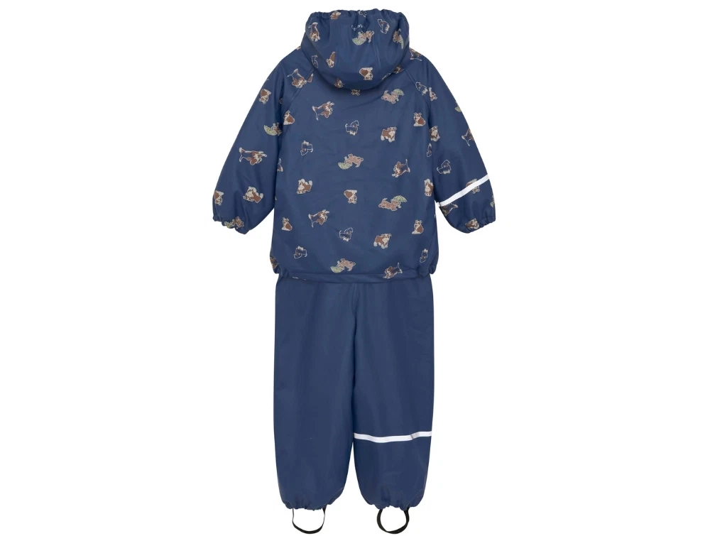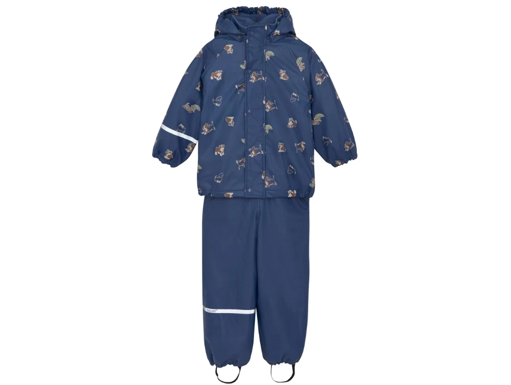 Regnsæt i en blå nuance (oceania) fra CeLaVi med et sjovt hundeprint og blødt fleecefoer. Regnsættet består af en regnjakke og et par ensfarvede regnbukser, der har justerbare seler i de små størrelser og elastik i taljen i de større. Sættet er perfekt til våde og kolde dage.