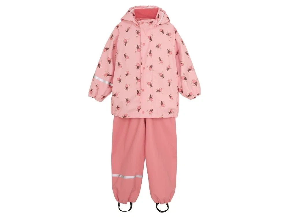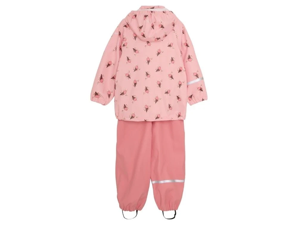 Regnsæt i rosa fra CeLaVi med blomsterprint på jakken og ensfarvede bukser samt refleksdetaljer på arm, ben og hætte.