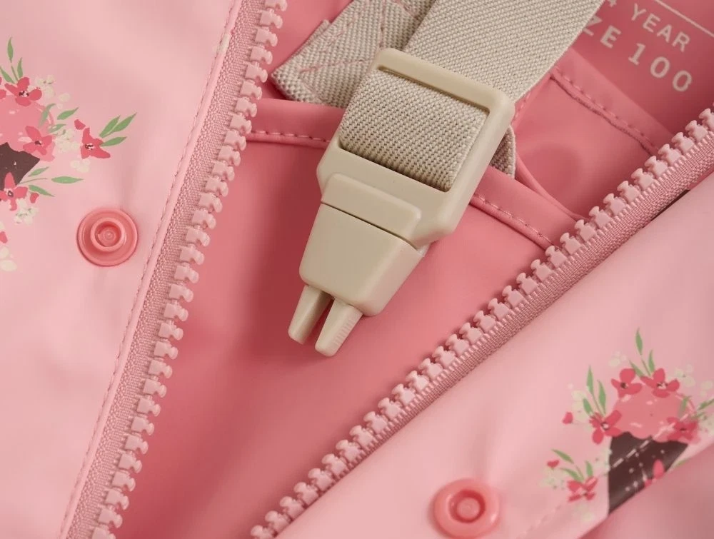 celavi regnsæt i rosa med blomsterprint og refleksdetaljer, set forfracelavi regnsæt i rosa med refleksstriber og hætte, set bagfracelavi regnbukser i rosa med seler og refleks, set bagfranærbillede af sele og knaplukning på rosa regnsæt fra celavinærbillede af refleksbånd og blomsterprint på rosa regntøj fra celavi