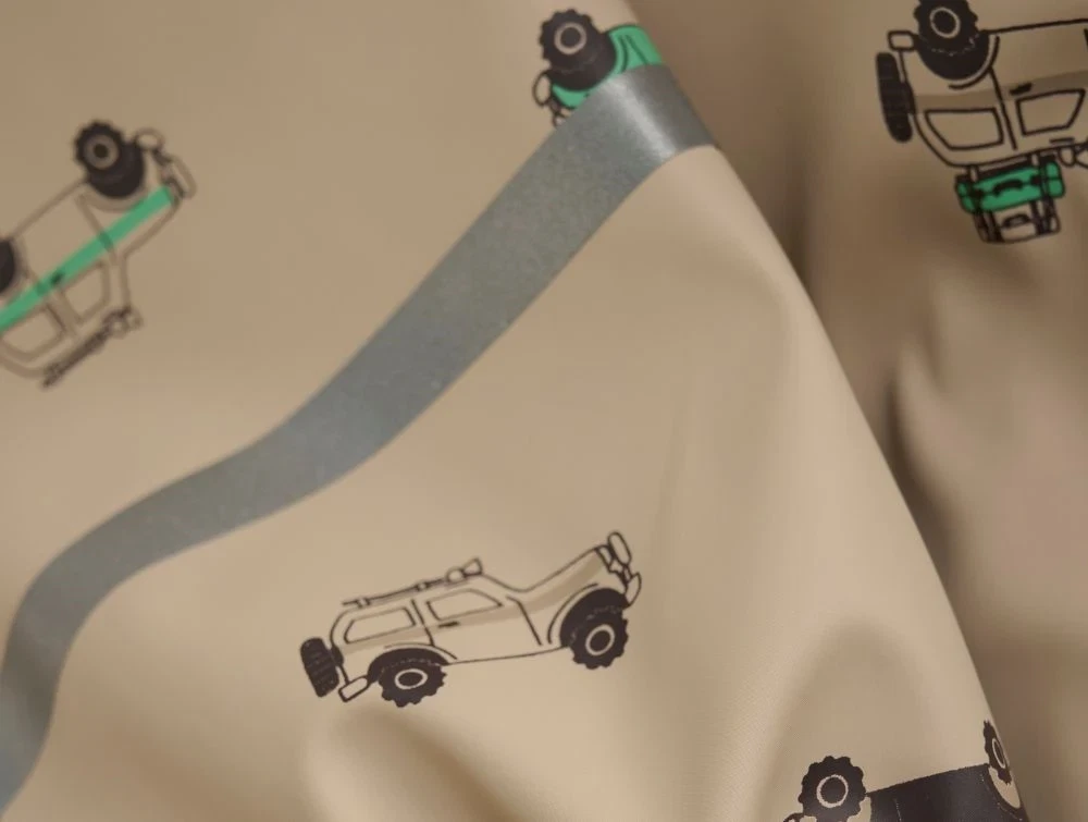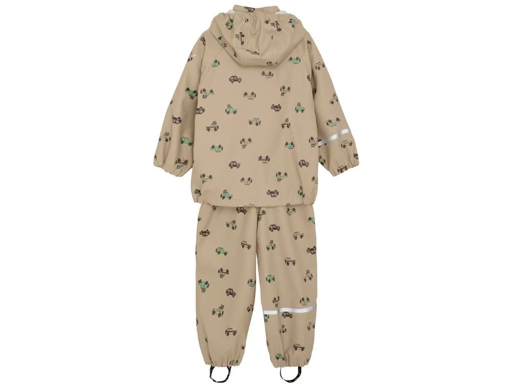 Beige regnsæt fra CeLaVi med print af små biler og refleksdetaljer på ærmer, ben og hætte.