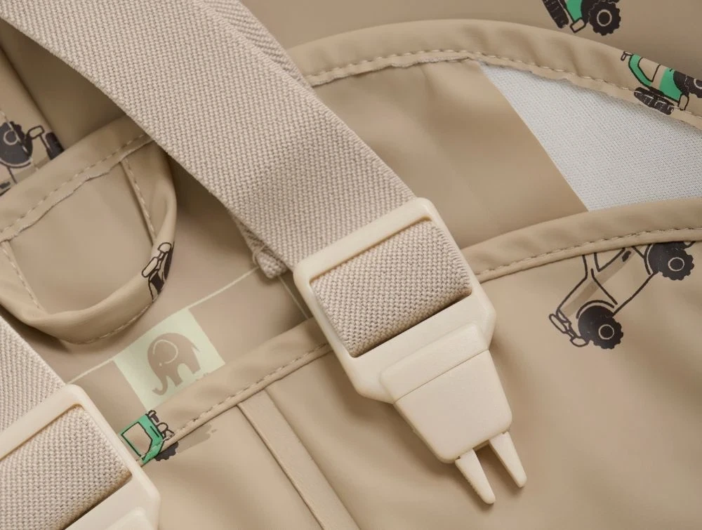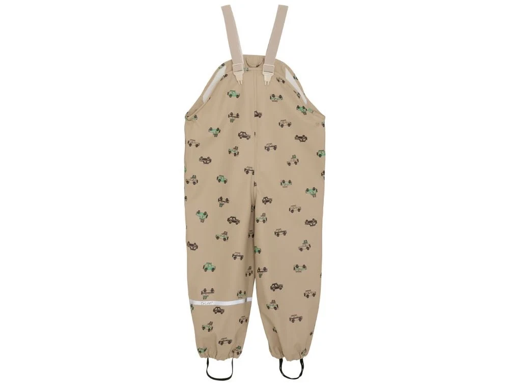 celavi regnsæt i beige med bilprint og refleksdetaljer, set forfracelavi regnsæt i beige med biler og hætte, set bagfracelavi regnbukser med sele og bilprint, set bagfranærbillede af refleksbånd og bilprint på regntøj fra celavinærbillede af sele og detalje på beige regnsæt fra celavi