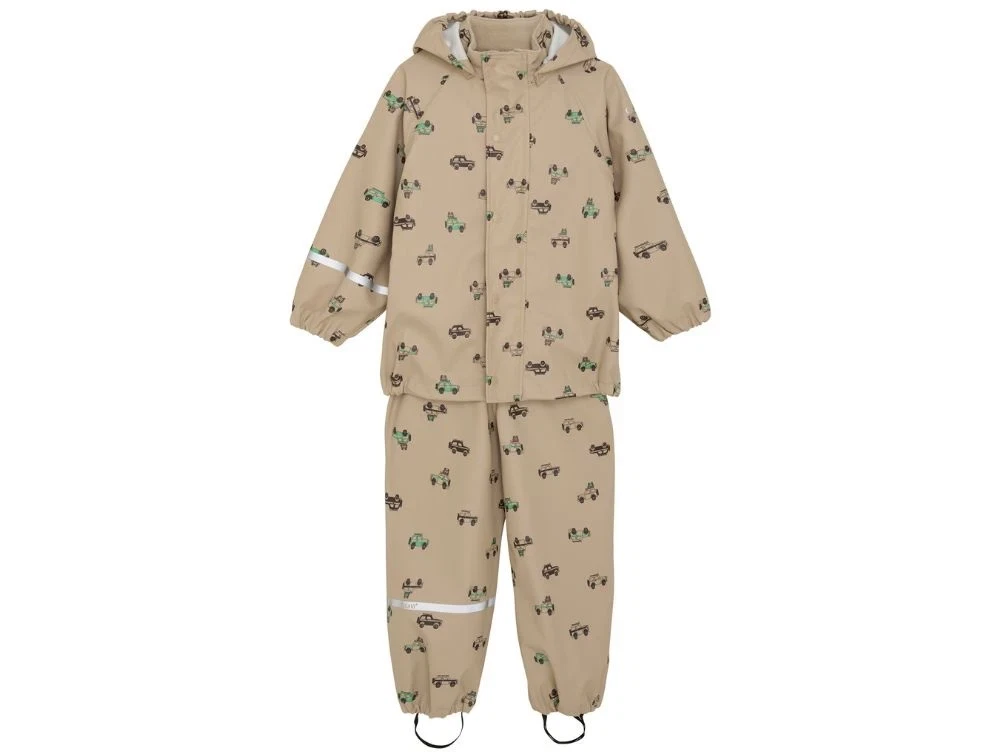CeLaVi regnsæt i beige med bilprint og refleksdetaljer