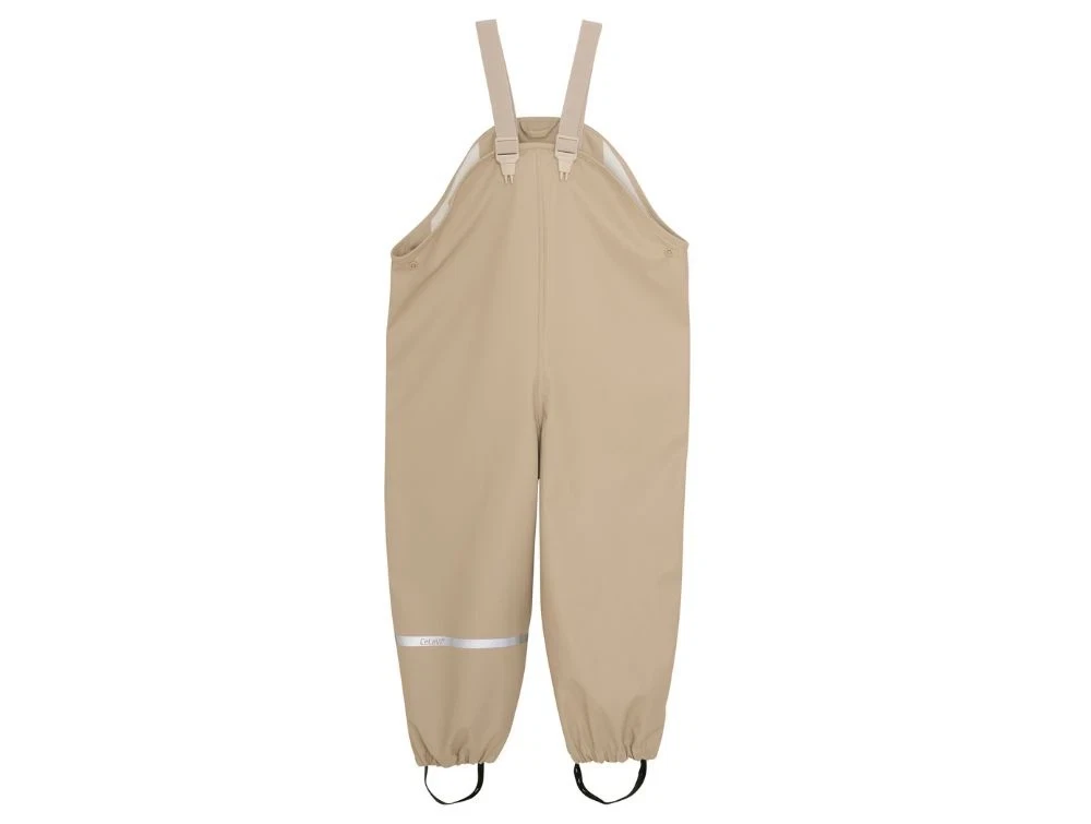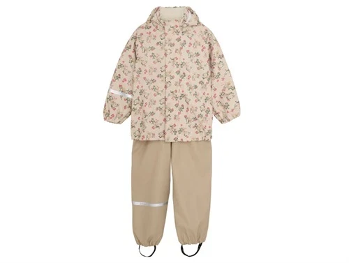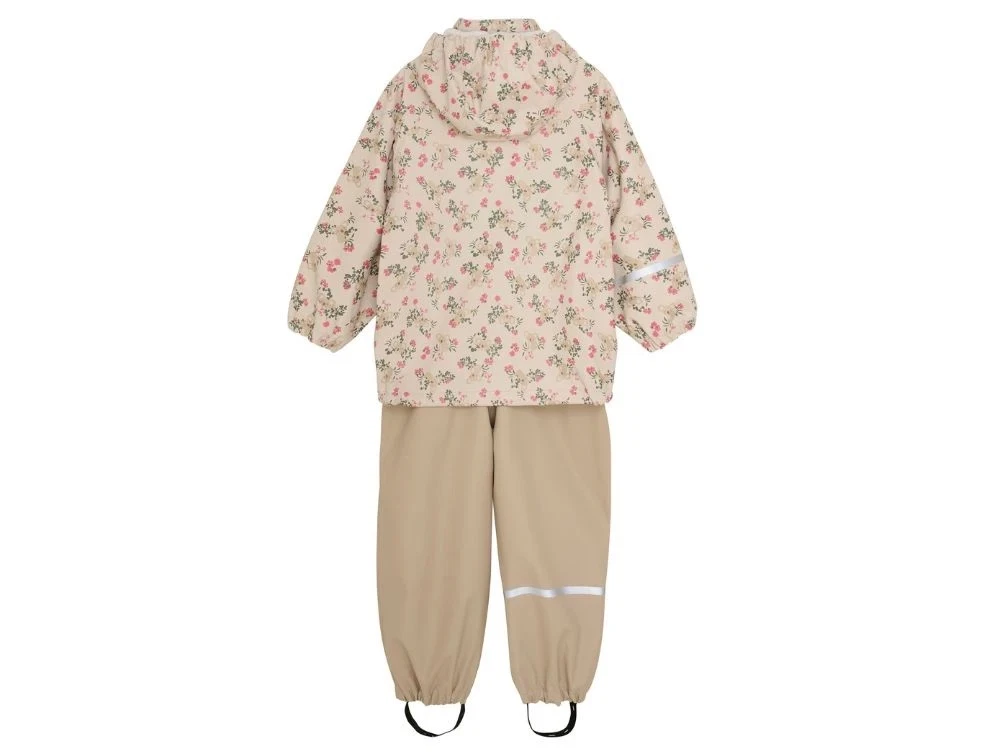 Regnsæt i beige fra CeLaVi med blomsterprint på jakken og ensfarvede bukser samt refleksdetaljer på arm, ben og hætte.