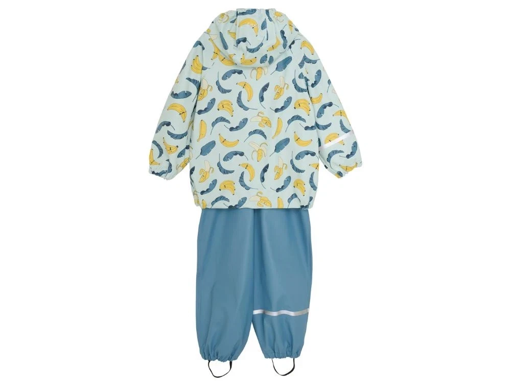 Regnsæt fra CeLaVi i blå nuancer (blue heaven) med print af gule bananer og palmeblade.