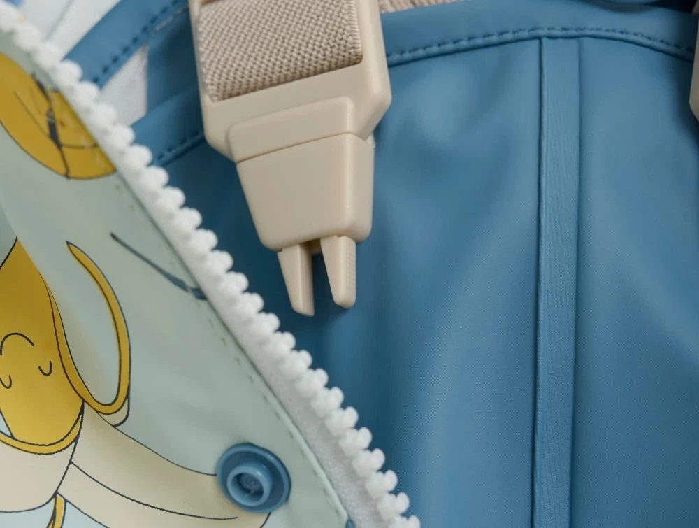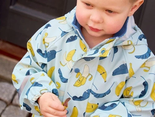 Dreng i regnjakke med bananprint fra CeLaVi 310454 7660 blue heavenBlåt regnsæt med printet bananer på jakke og solide ensfarvet blå bukser fra Celavi 310454 7660 blue heavenBlåt regnsæt med printet bananer på jakke og solide ensfarvet blå bukser fra Celavi 310454 7660 blue heaven bagfraEnsfarvet blå regnbukser fra Celavi regnsæt 310454 7660 blue heavenSpænde på regnbukser fra Celavi regnsæt 310454 7660 blue heaven