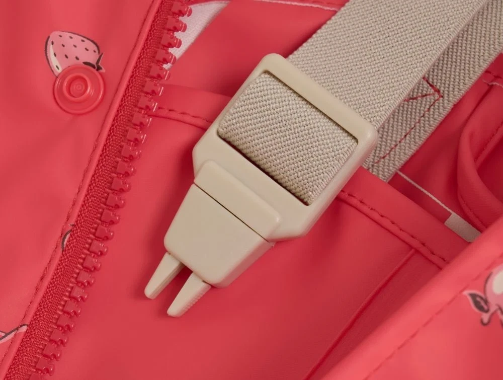 Regnsæt fra CeLaVi i rød (cayenne) med rosa frugtprint på jakken – jordbær, kirsebær og æbler.
