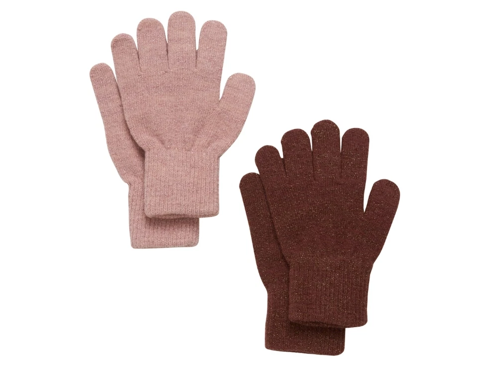 2-pak CeLaVi magic glitter strikfingervanter i lys rosa og mørk brun nuance med glimmereffekt. Handskerne har en tæt pasform med ribkant ved håndleddene, som hjælper med at holde dem på plads. Begge par har tommelfinger og er ensfarvede med diskret glitter.