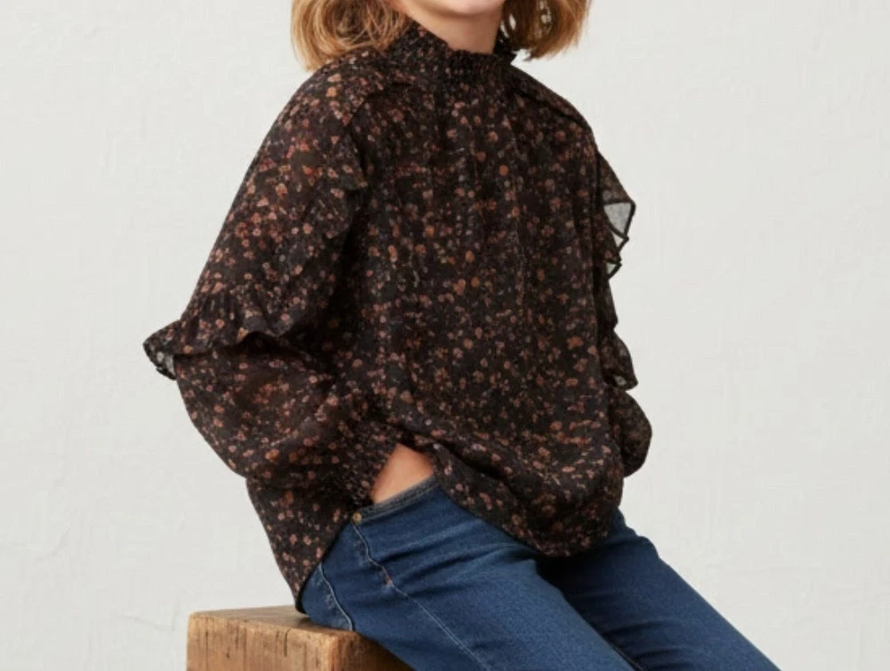 Sort bluse med blomsterprint, høj hals og flæser fra Creamie.