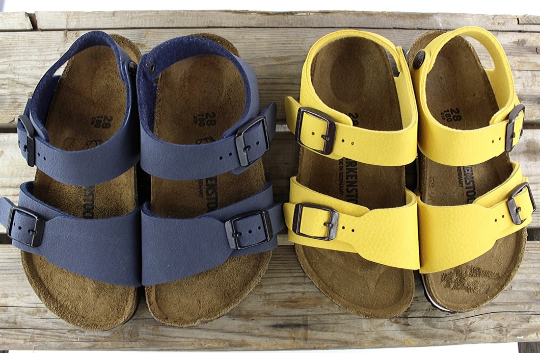 Det er vores vurdering at den smalle model passer til medium og smallere fødder og at modellen, som Birkenstock kalder "normal" faktisk rummer en ret bred fod. Det gule par Birkenstock sandaler på billedet er den smalle udgave og det blå par er den bredere udgave. Bonusinfo: Birkenstock er en af de få sandaler på markedet, som har svangstøtte.