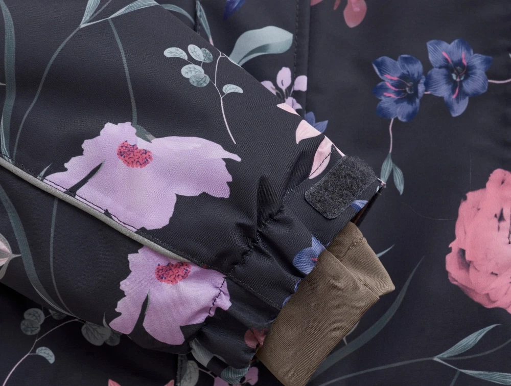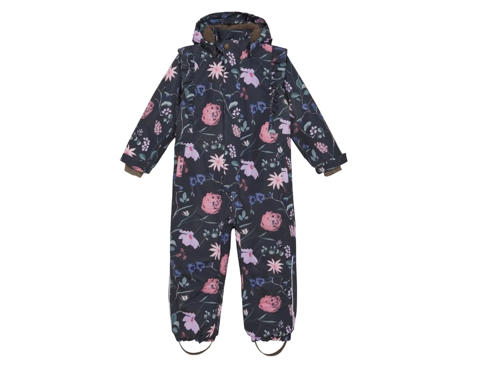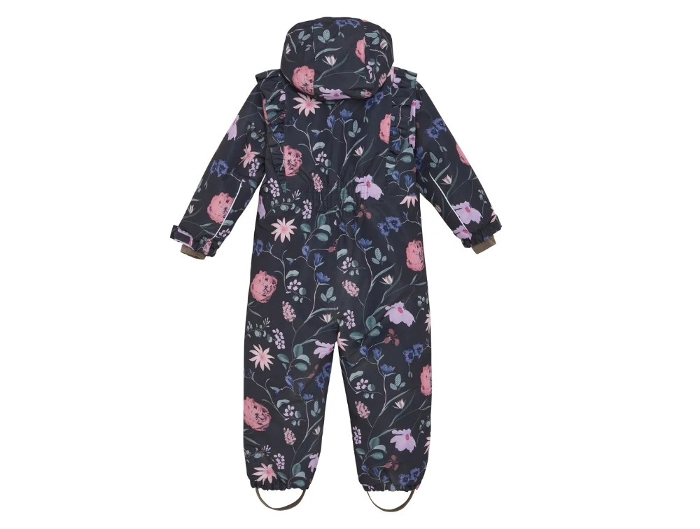 Flyverdragt i mørk nuance fra En Fant med et flot blomstermønster i rosa og lilla toner samt fine flæsedetaljer. Dragten er vandtæt med tapede sømme og har god åndbarhed.