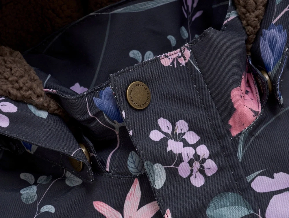 En Fant flyverdragt i ebony med blomstermønster og flæserEn Fant flyverdragt i ebony med blomstermønster og flæser set bagfraNærbillede af ærme på En Fant flyverdragt i ebony med blomstermønsterNærbillede af hætte og knapper på En Fant flyverdragt i ebony med blomstermønster